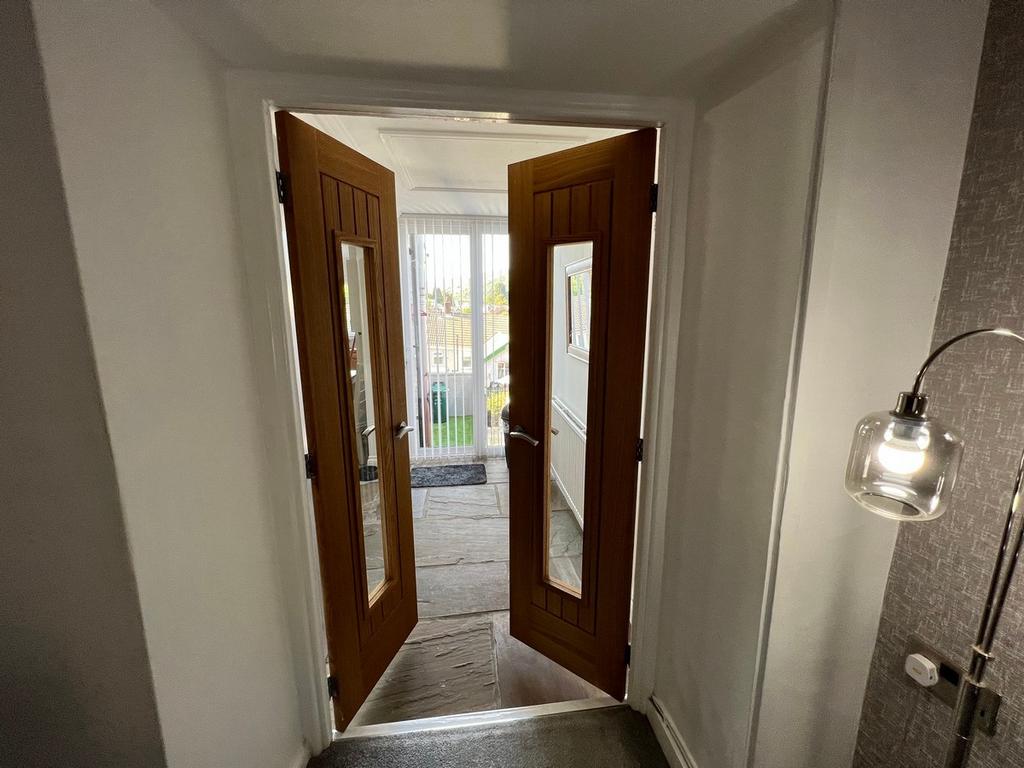Spacious entrance porchway with plastered emulsion décor and ceiling, boxed in and wall-mounted electric service meters, quality new fitted carpet, leaded glaze panel window to side through to lounge, modern oak panel door allowing access to open-plan lounge/diner.