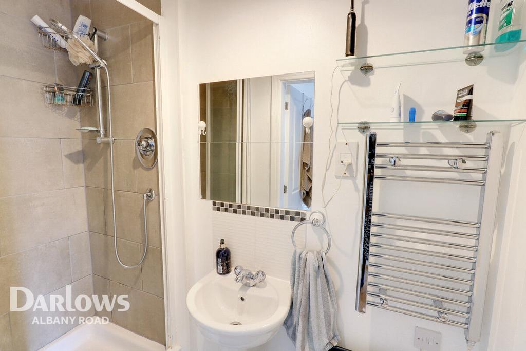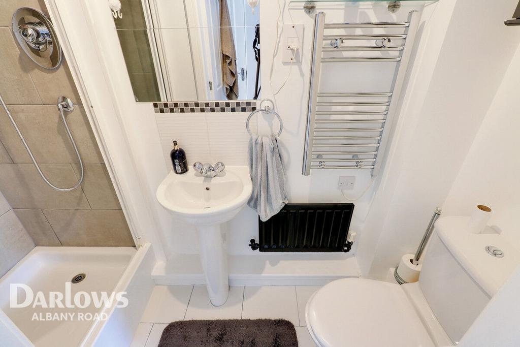 Shower room comprises of a WC, Shower Cubicle and wash basin with tiled splash back. Wall mounted heated towel rail with second radiator below.