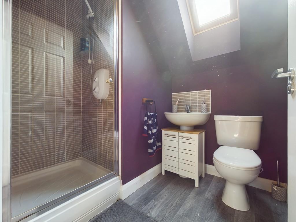 The en-suite is partially tiled with a shower cubicle.