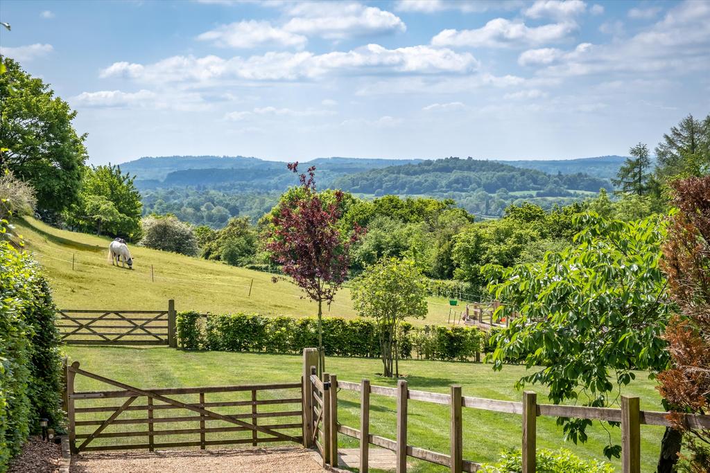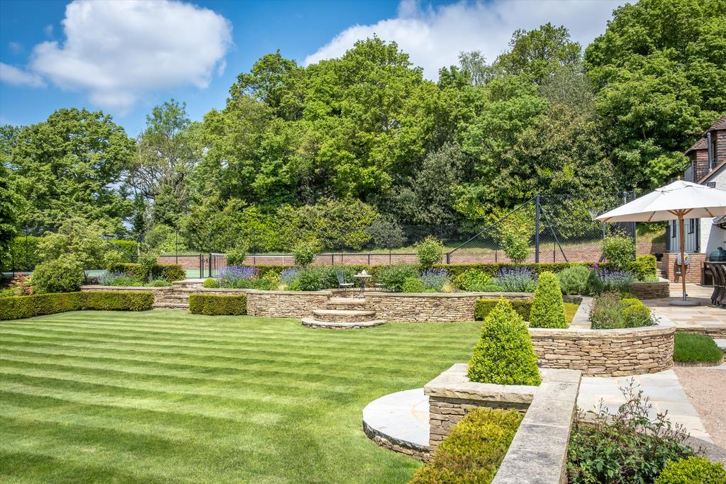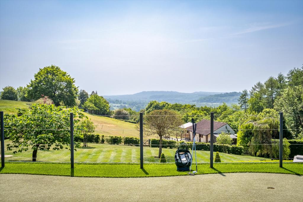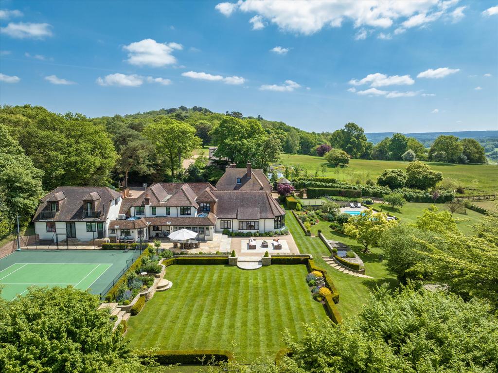 The splendid south and west-facing gardens and grounds extend to over 4 acres which comprise a large wrap-around terrace and formal manicured gardens, a tennis court, swimming pool, gym with putting green above for those golf enthusiasts as well as a children's play area. Beyond the more formal gardens and lawns are the paddocks, complete with two stables, feed and tack rooms, as well as hay and log stores. The rear of the house, large terrace area and swimming pool all face south with far-reaching views