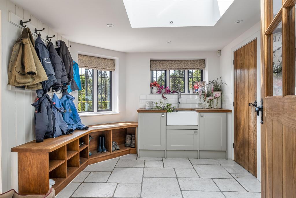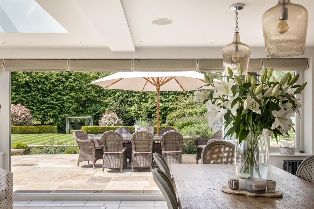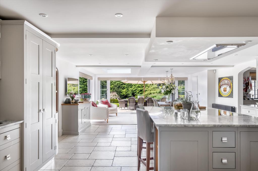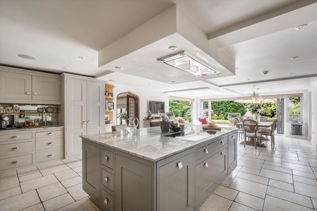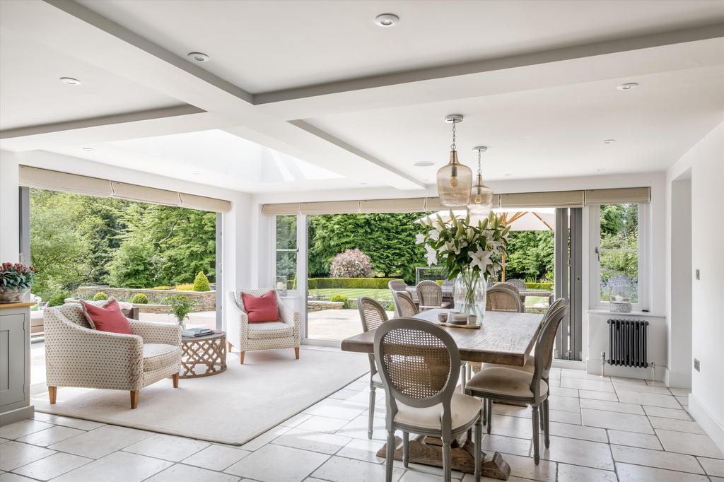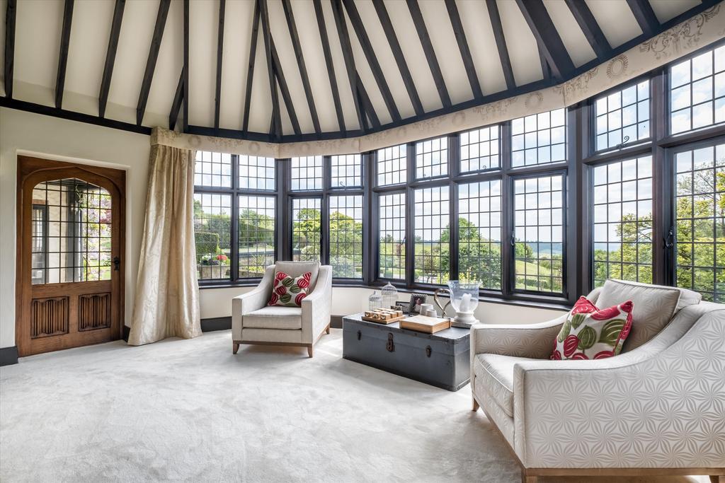 The kitchen is clearly the heart of the home. It has been extended by the current owners to incorporate a fantastic family dining space with bi-folding doors opening out onto both the south & west facing terraces. The formal dining room is located on the southeast side of the house and offers a double aspect with stunning southerly views. In addition, there is a sitting room at the front of the property, perfect for the cozy winter nights.
