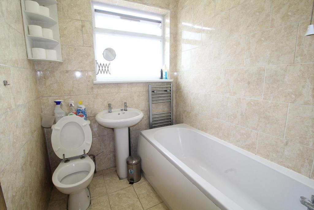 Frosted double glazed casement window to rear, fully tiled walls, chrome heated towel rail, white contemporary style suite comprising panel bath with mixer tap and shower attachment, pedestal wash hand basin, dual flush wc, tiled floor.