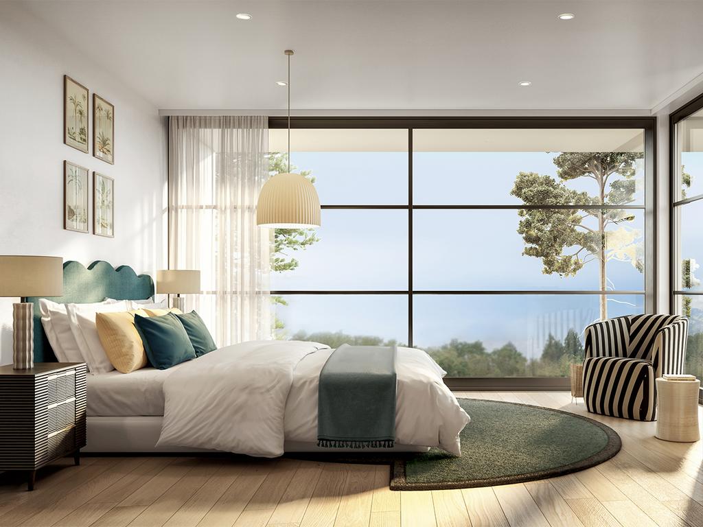 On the first floor, the main living space awaits, with a massive expanse of glass to the front and two walls of glass to the rear, providing an ideal vantage point to enjoy the late afternoon and evening sun as it faces in a westerly direction. Sliding patio doors give access to the rear terrace, overlooking the open fields. The kitchen sits just off the dining area and is fitted with a comprehensive range of base and wall units, together with a central island incorporating an induction hob and extraction. The kitchen is fully fitted out with Smeg appliances, including a full-height fridge and separate freezer, dishwasher, oven, and combi oven, all topped off with HiMacs White worktops and 150mm upstand (upgrade options available). Also on this floor is the principal bedroom, with a full-height, fully glazed window that wraps around the side, providing an airy feel with views down the valley. The principal bedroom also has an en-suite shower room with the same specifications and a separate day use W/C.