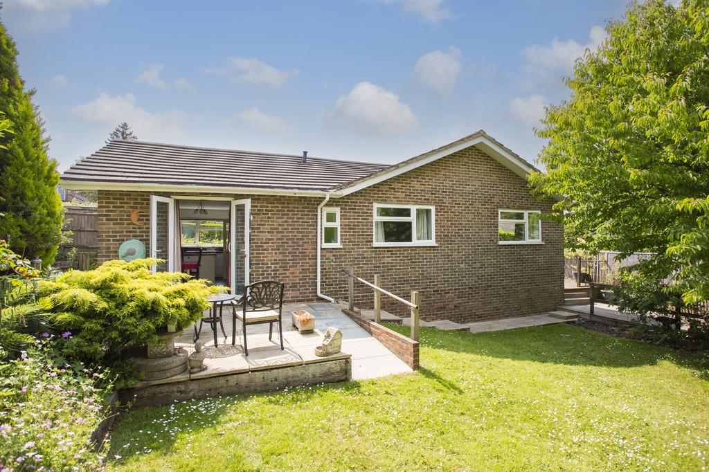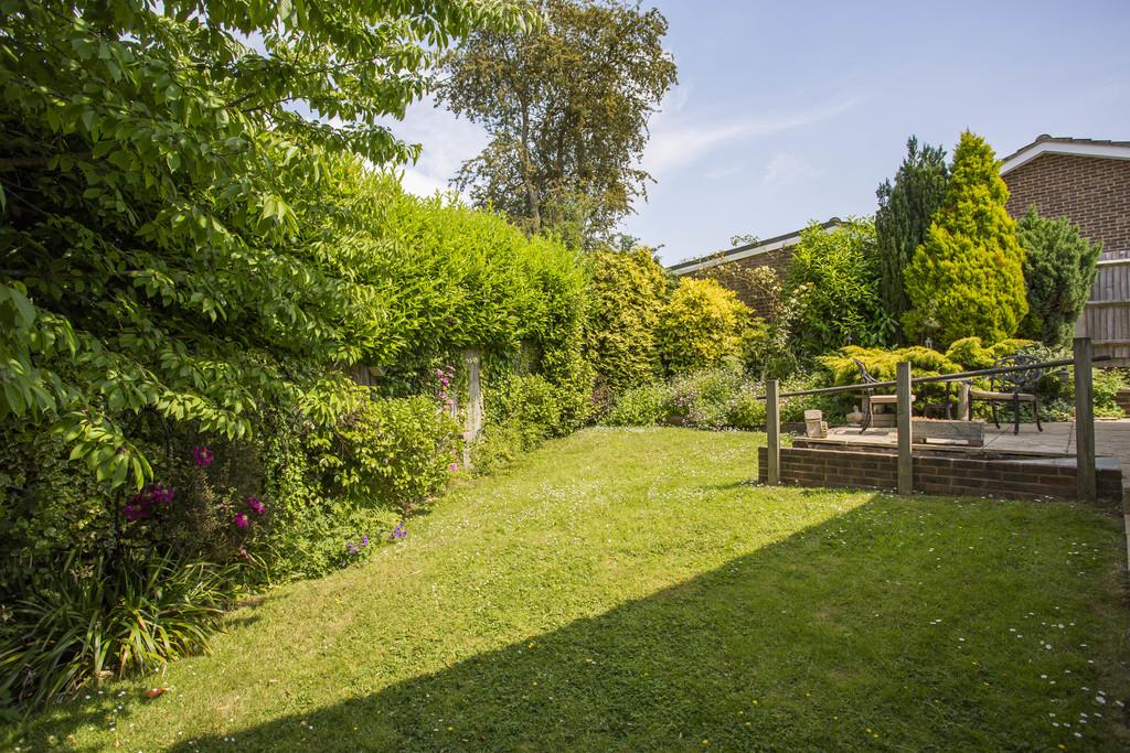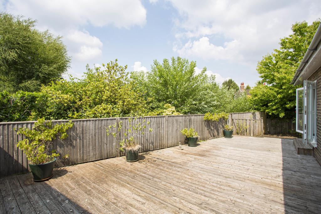 OUTSIDE REAR: Adjacent to the kitchen/diner is a patio with the garden principally laid to lawn and a large decked area with views towards Groombridge and the North downs along with various trees, shrubs and ornamental pond.