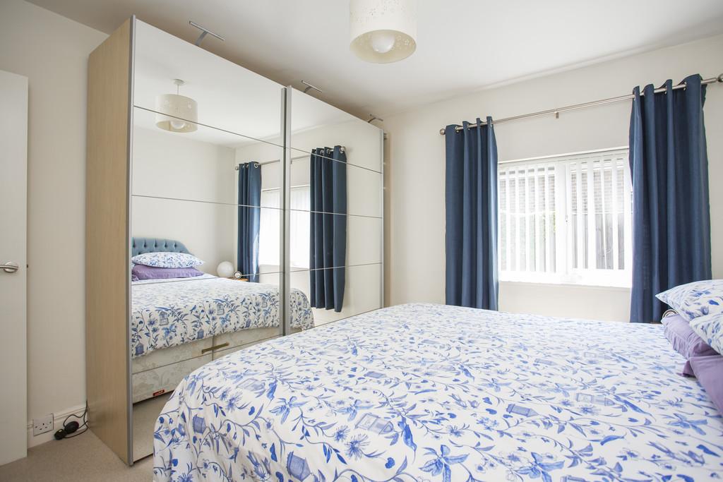 BEDROOM: Wardrobe cupboard with shelving, carpet as fitted, radiator, window to side and uPVC double doors opening to a decked area.