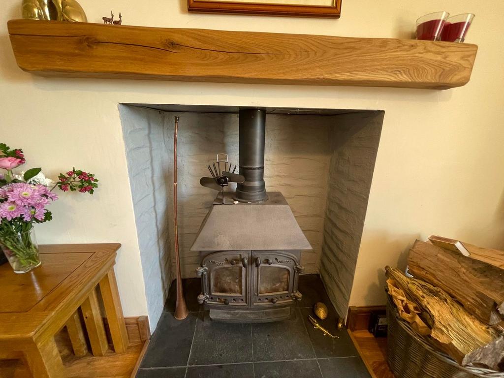 12' 0" x 14' 7" (3.66m x 4.45m) Character sitting room with open fireplace, Villager woodburning stove on slate hearth, oak mantelpiece, double glazed sash window to front, central heating radiator, alcove, wall lights, laminate flooring, door into -