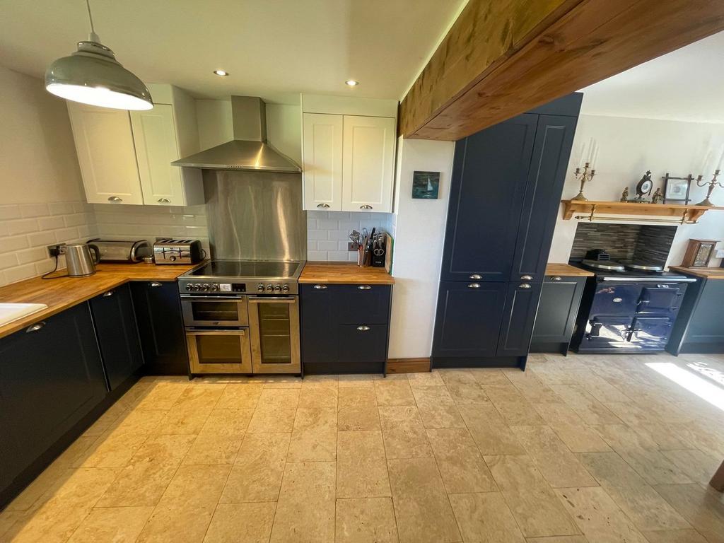 22' 2" x 11' 2" (6.76m x 3.40m) A perfect room for entertaining room, comprising of a modern two tone midnight navy / cream base and wall units with oak working surfaces above, belling electric range oven with 5 ring ceramic hob above, Extractor hood, 1 1/2 drainer sink with double glazed window above with glorious views over Cardigan bay, the Cambrian mountains and as far as the Llyn peninsula , oil fired AGA range, central heating radiator, Terrazzo tiled flooring, integrated appliances, include dishwasher, fridge freezer, spotlights to ceiling, multiple sockets, double glazed window to front, half glazed door to front, tiled splashback, door to rear garden.