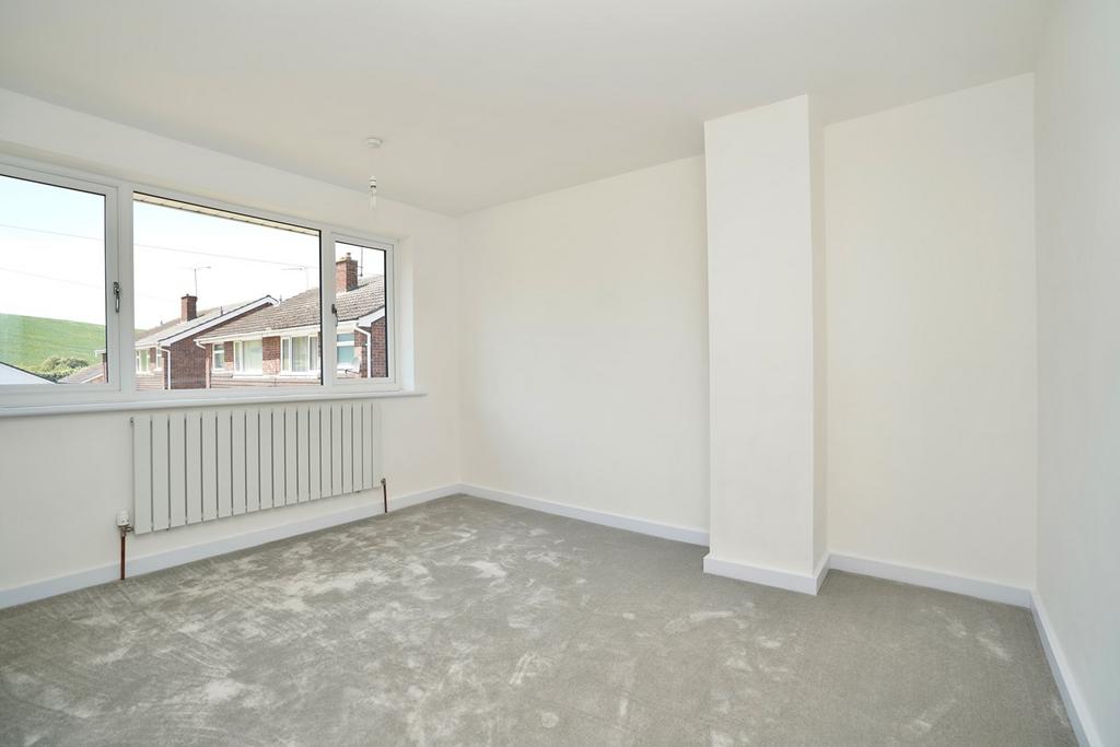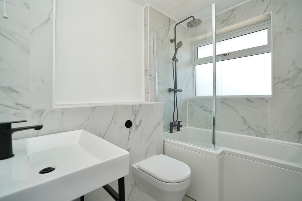 Re-fitted in a quality range of white sanitary ware incorporating framed vanity wash hand basin with mono bloc mixer tap, low level WC with concealed cistern, 'P' shaped panel bath with contemporary screen, mixer tap and independent power shower fitted over, UPVC window to front aspect, anthracite heated towel rail, extensive ceramic tiled surrounds, porcelain floor tiling.