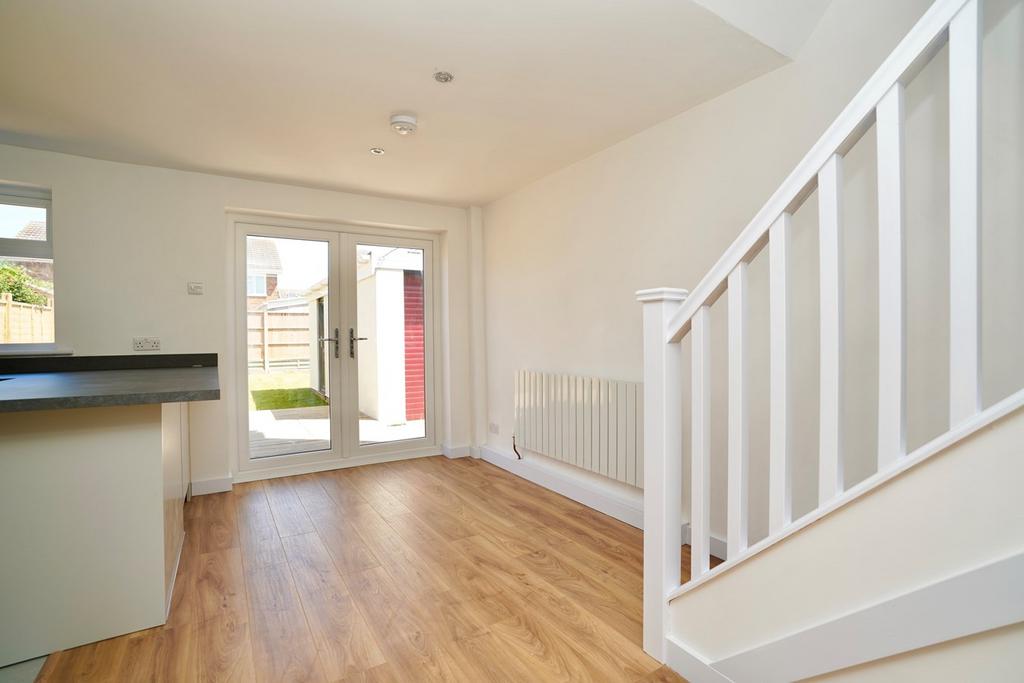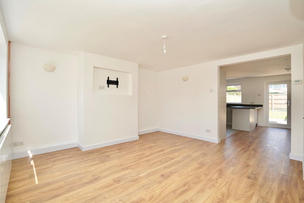 UPVC window to front aspect, radiator, wall light points, recessed media unit, TV point, telephone point, door to under stairs storage cupboard with new consumer unit, engineered wood flooring, open plan to