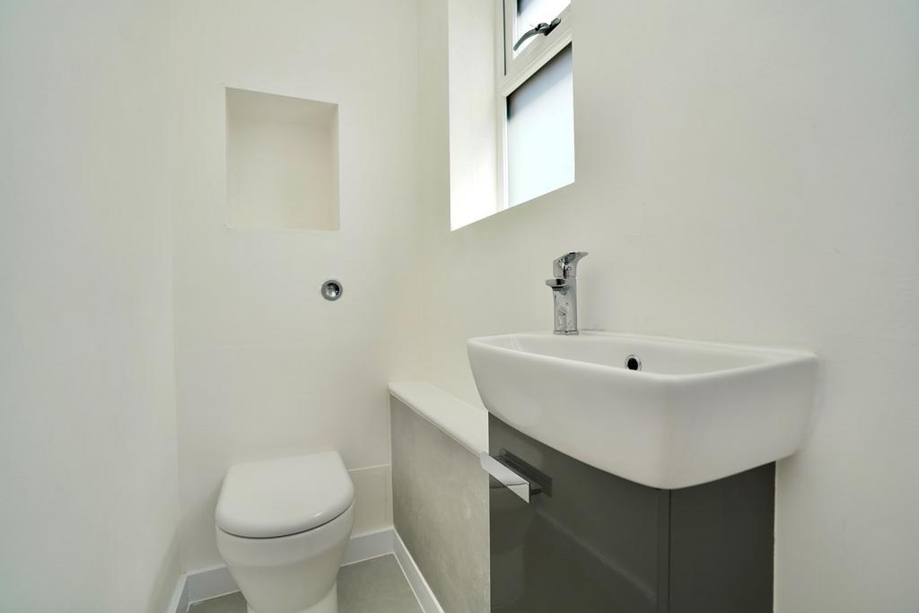 Re-fitted in a two piece contemporary white suite comprising low level WC, vanity wash hand basin with mixer tap and cabinet storage, UPVC window to side aspect, display recess, ceramic tiled flooring.