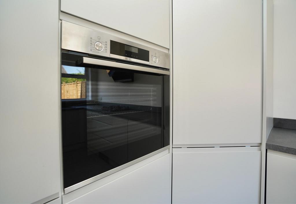 A light open plan contemporary space with UPVC French doors to garden terrace and UPVC window to garden, fitted in a range of matte grey handleless units with complementing work surfaces and up-stands, central peninsular unit incorporating breakfast bar, single drainer resin sink unit with mixer tap, integral Bosch gas hob with suspended extractor unit fitted above, large walk in larder unit, drawer units, pan drawers, integrated appliances incorporating automatic AEG dishwasher, integral Bosch electric oven and fridge freezer, recessed lighting, stairs to first floor, contemporary porcelain floor, Sweepovac skirting level vacuum system.