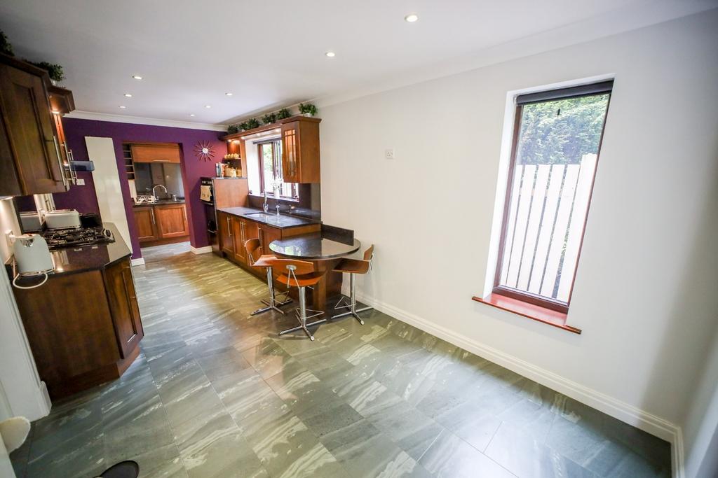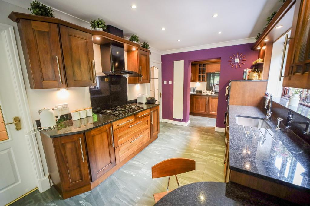 Fitted Kitchen with a range of Wooden Wall and Base Units, Black Quartz Worktop with matching Splashback, Two Inset Sinks and Drainers with Mixer Taps, Integrated Electric Oven and a Five Ring Gas Hob, Integrated Fridge, Freezer, Dishwasher and Washing Machine.