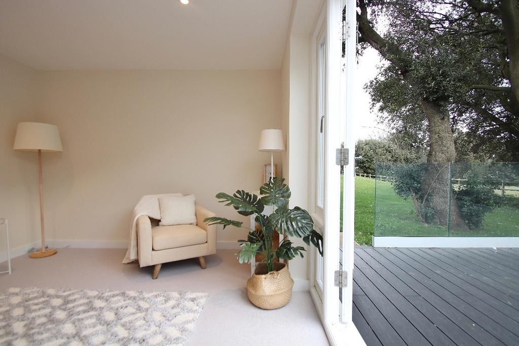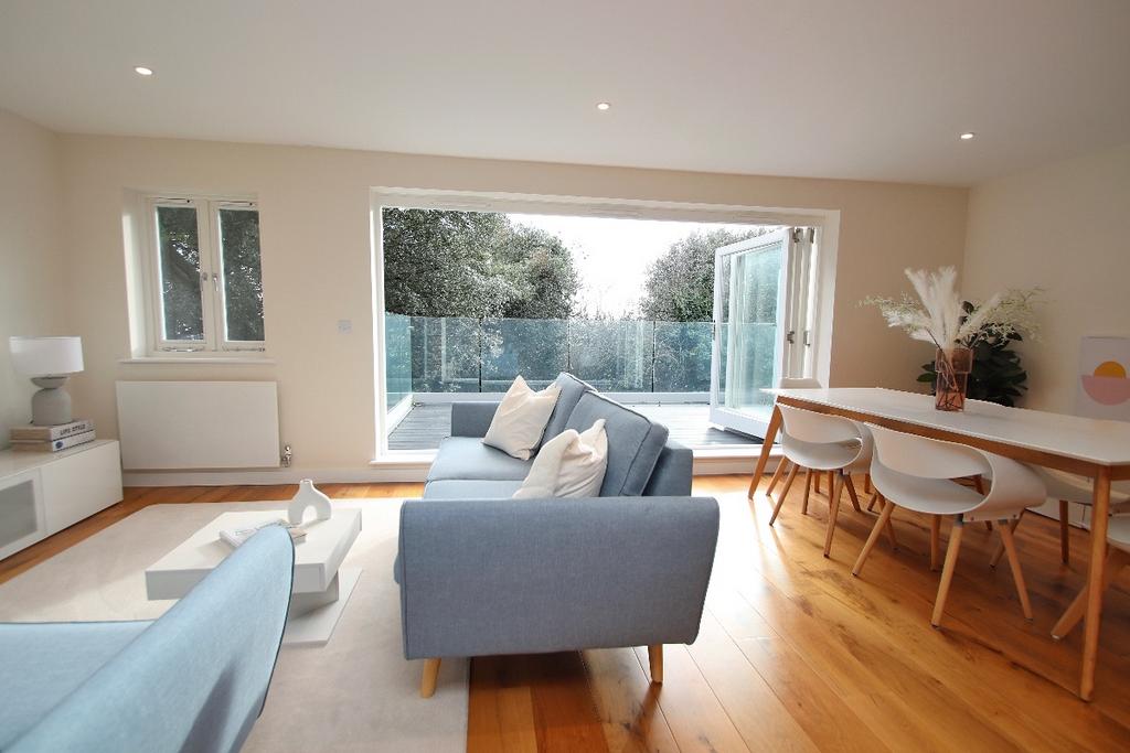 Ascending to the first floor, you'll discover the heart of the home-the living room seamlessly integrated with an open-plan kitchen that will leave you in awe. Every detail has been thoughtfully curated to create a space that is not only visually stunning but also functional. The solid flooring exudes elegance and spaciousness, almost resembling a dance floor. However, the true highlight lies in the bi-fold doors that open fully, revealing a vast raised terrace overlooking the meadow and the distant sea. With such captivating views, you may find it tempting to simply stay home and revel in the beauty of your surroundings. Additionally, another convenient feature awaits-a separate WC and utility area that further enhances the enjoyment of the living space.