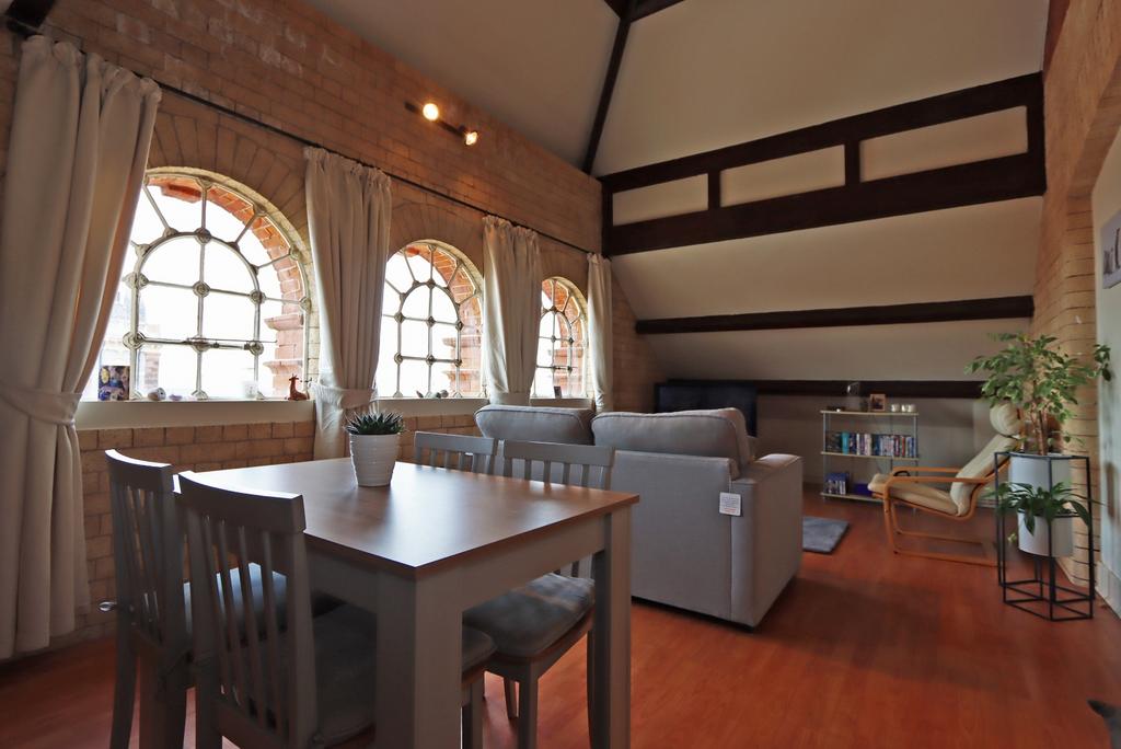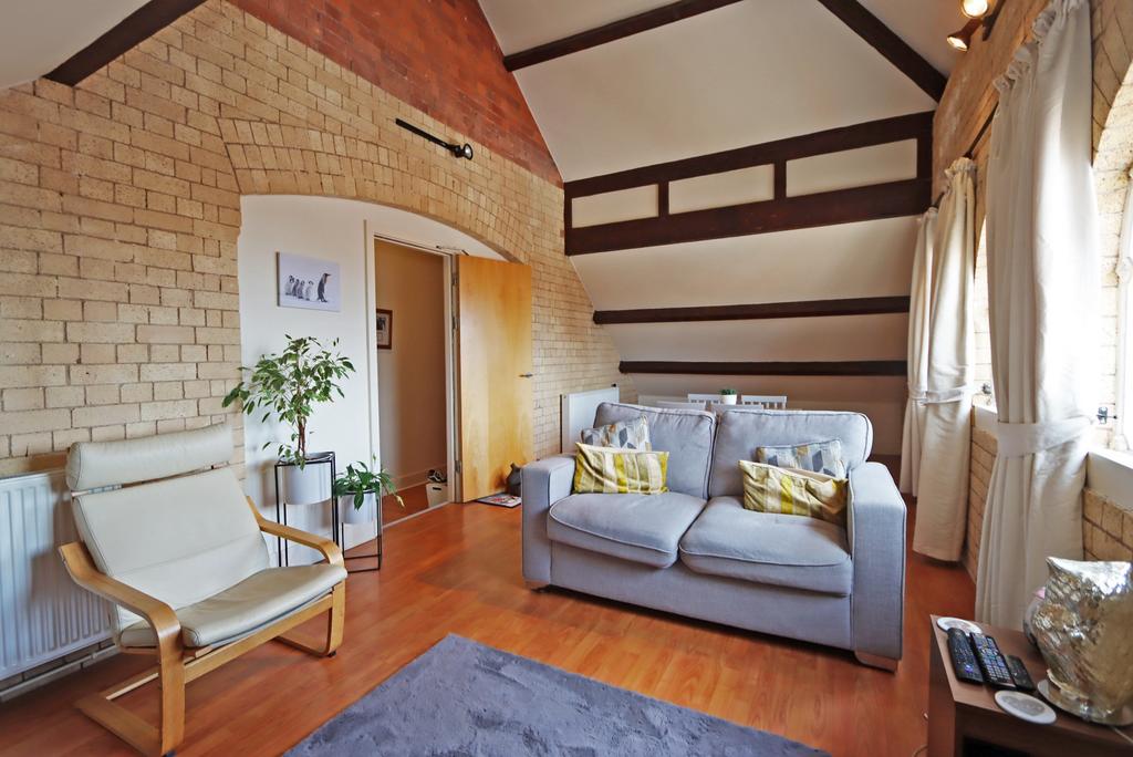 Living Room (8.66m x 3.45m) - The heart of the property has three original feature windows which shows an amazing view of the town as well as a vaulted ceiling with original rafters and brickwork