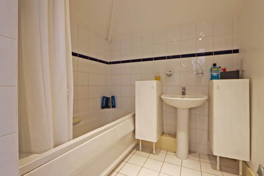 Bathroom - Spacious bathroom with tiled flooring and a shower over the bath.