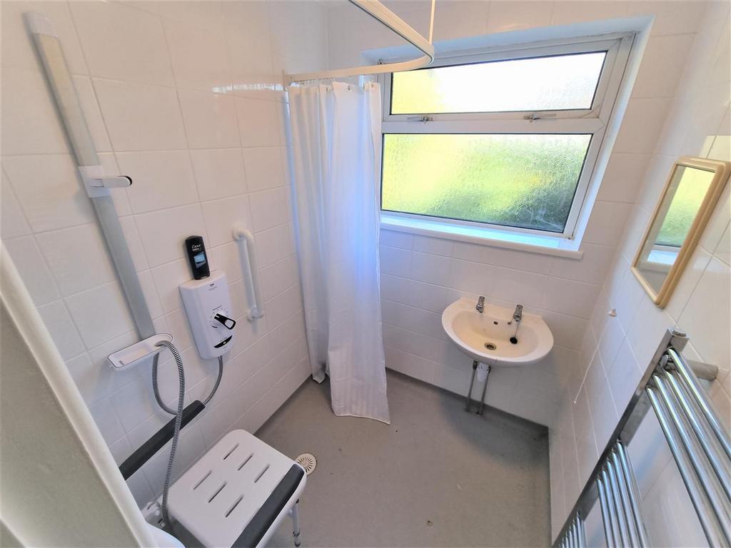 Shower Room - Rear aspect window. Walk-in shower area with shower curtain screen. Electric Mira shower system. Fully tiled walls. Wash hand basin. Mains extractor fan. Heated towel rail.