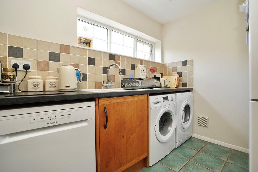 UPVC double glazed door to side aspect and double glazed window to front aspect, recessed downlighters, fitted in a range of base and wall mounted units, complementing work surface and tiled surrounds, one and a half bowl single drainer sink unit with mixer tap, spaces and plumbing for dishwasher and washing machine, spaces for tumble dryer, fridge and freezer, cupboard housing oil fired central heating boiler, tiled floor, wall mounted consumer unit.