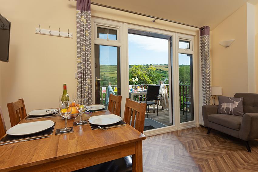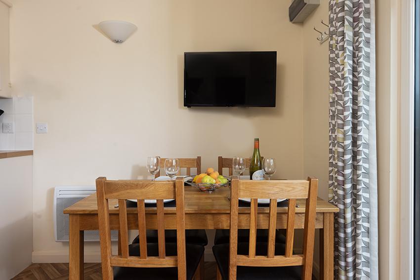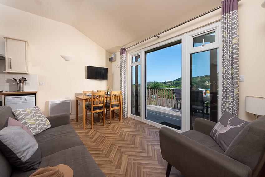 A unique holiday home proposition on the North Devon coast. Chalet 6 at Manleigh Park, near pretty Combe Martin, is a two-bedroom holiday home, with a private decked area and beautifully scenic views. Featuring French Doors, so you can open up your open plan living area to the sea breezes and outdoor furniture for enjoying meal times in the sun. Modern furnishings provide a comfortable living area complete with family dining setting and wall-mounted TV, for relaxing time together and a fully equipped kitchen provides all the amenities you need for an easy self- catered holiday including a microwave and dishwasher.
