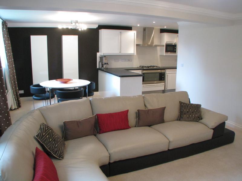 KITCHEN - Fully fitted kitchen with stainless steel sink and drainer, AEG 5 ring gas burner, oven and extractor hood, integrated microwave, washer/dryer, integrated dishwasher, fridge, freezer, part tiled walls, Amtico floor.