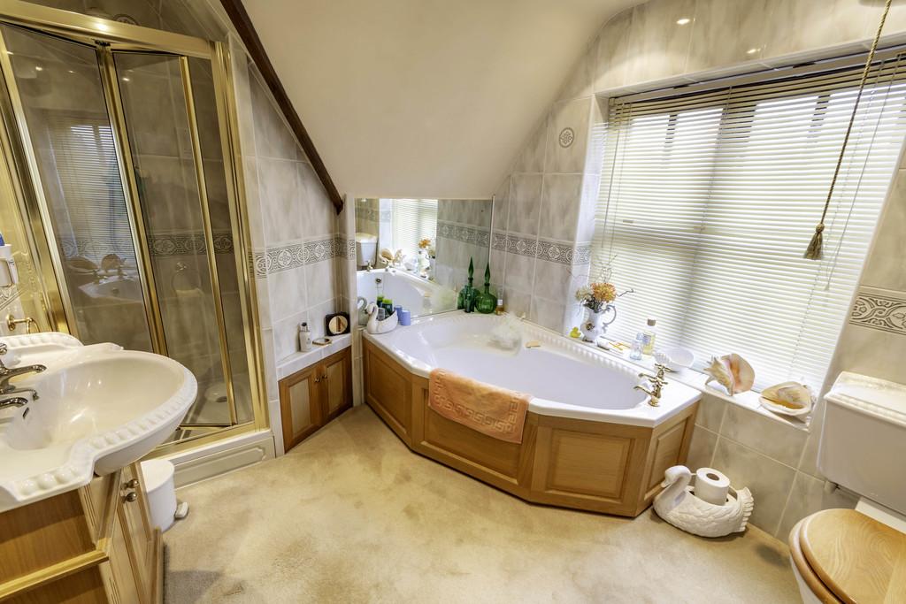 HOUSE BATHROOM white suite of offset corner bath, separate