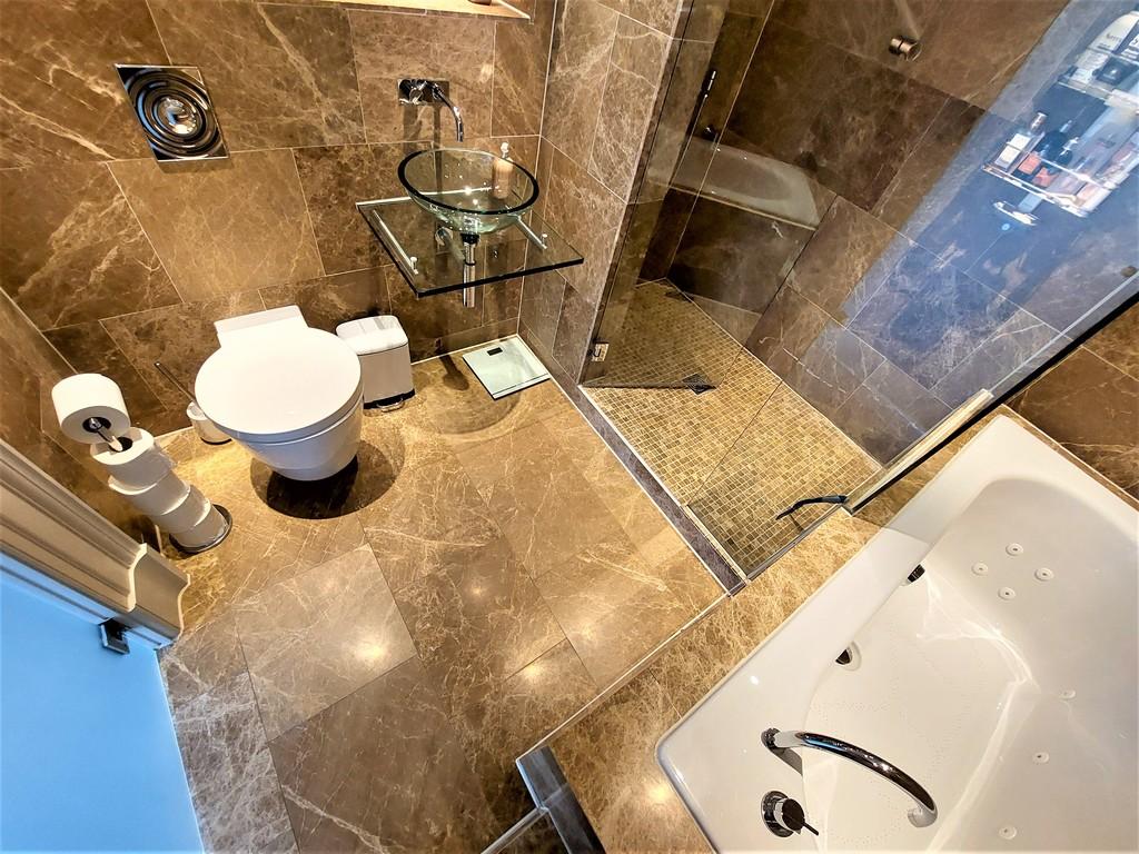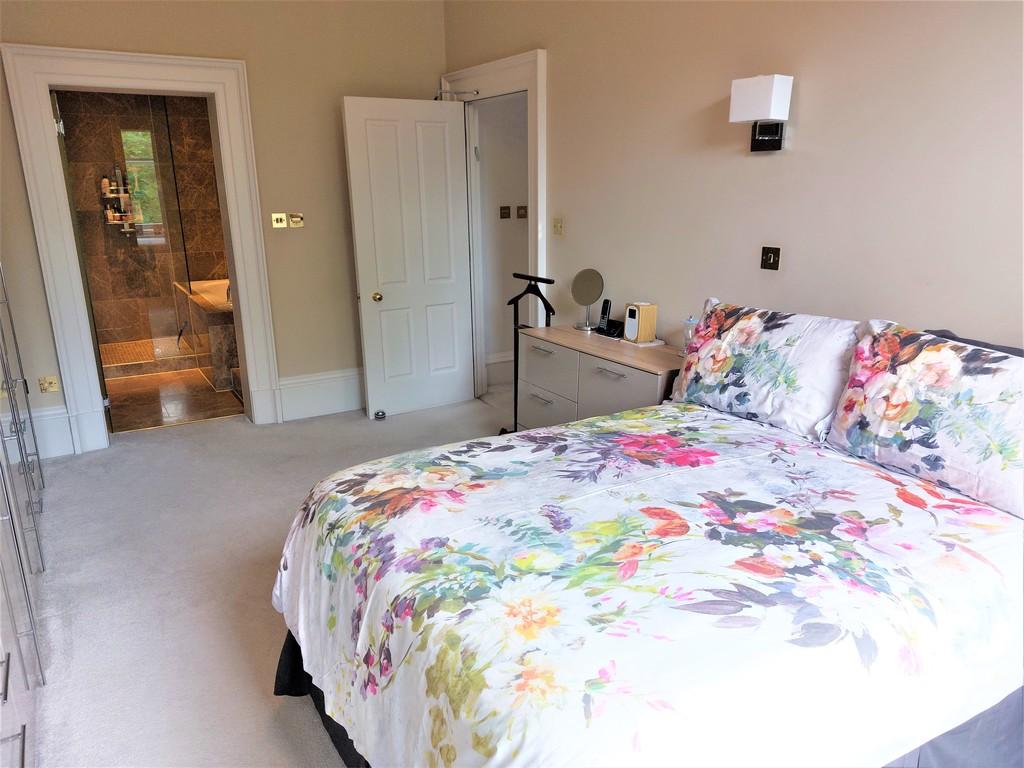 EN SUITE With a four piece suite comprising low level toilet, glass sink, Jacuzzi bath and spacious walk in shower cubicle. Tiled walls and flooring. Heated towel rail. Recess low voltage spotlights. Extractor fan.