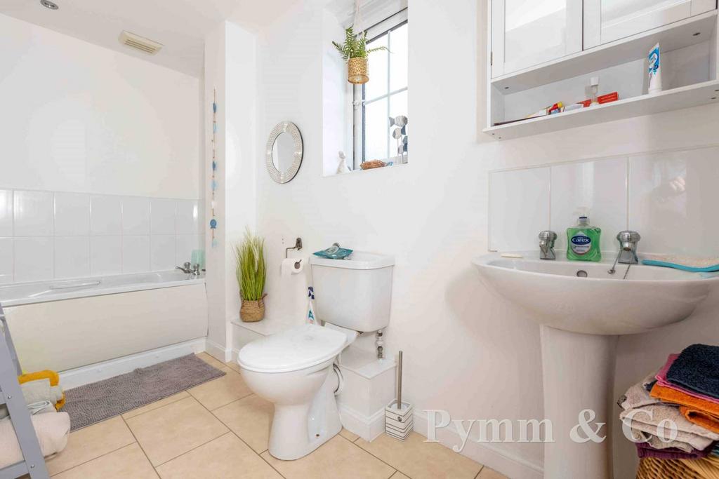 Velux window to the rear, bath, wash basin, low level WC, tiled splashbacks, tiled floor.