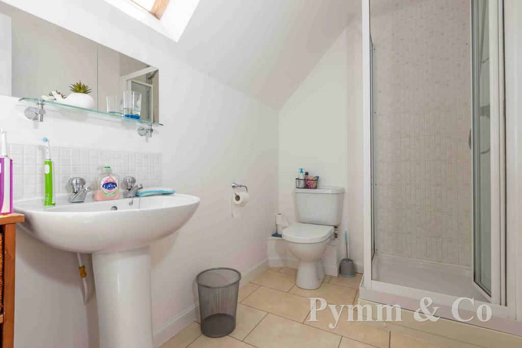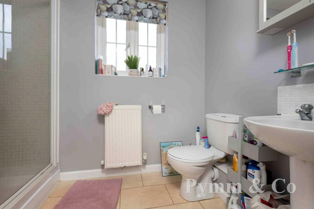 Double glazed obscure window to the rear, shower cubile, wash basin, low level WC, tiled splashbacks, tiled floor.