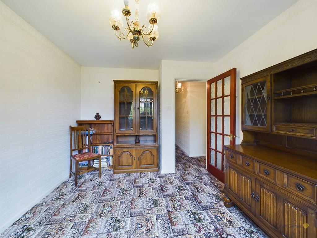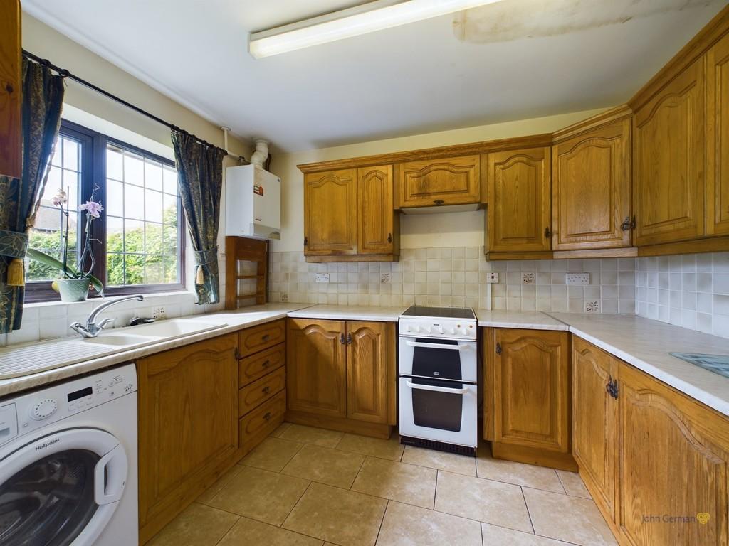 The dining kitchen has double doors that lead out to the established rear garden and a range of timber finished base and wall units together with work surfaces and splashback tiling.