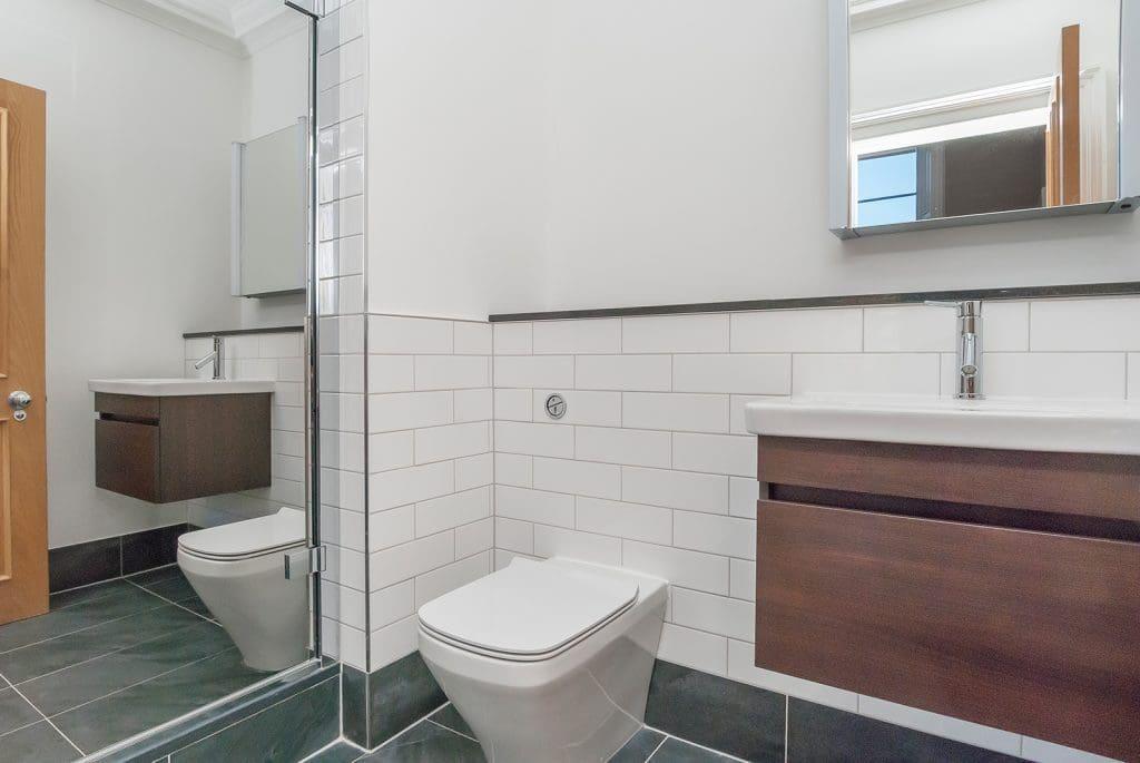 ~Family bathroom with contemporary shower over bath and modern, three-piece suite