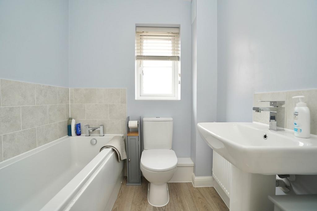 Fitted in a three piece contemporary white range of sanitary ware comprising low level WC, pedestal wash hand basin with mono bloc mixer tap, ceramic tiling, single panel radiator, extractor, UPVC window to rear aspect, panel bath with mixer tap, extensive tiling, composite floor covering.