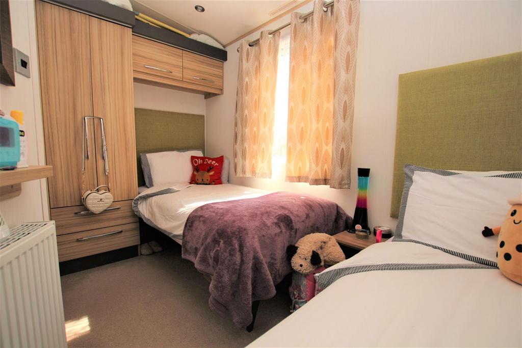 Double glazed window to side, double radiator, two single beds, vaulted ceiling with recessed spot lighting.