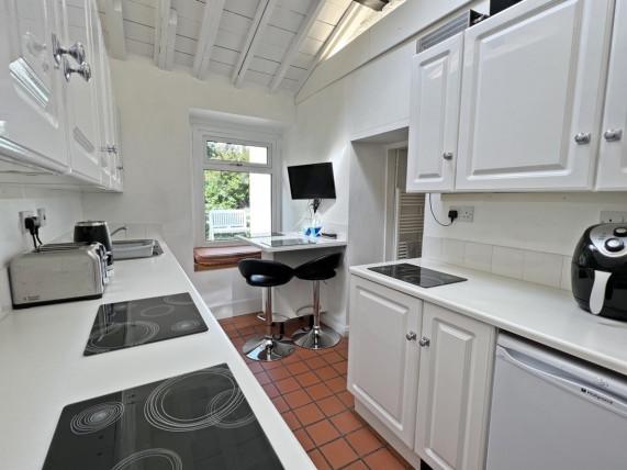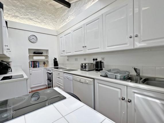 KITCHEN (124 x 610 approx.) Fitted with a range of gloss white wall and base units. Freestanding electric cooker. Under counter fridge and freezer and dishwasher. Attractive beamed ceiling. Quarry tiled floor. Breakfast bar with window seating.