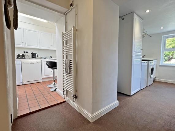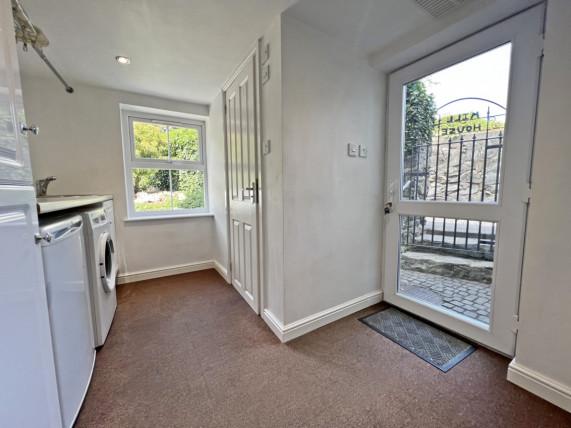 UTILITY ROOM (98 x 710 approx.) Worktop incorporating sink. Plumbed for washing machine and dryer. Glazed door to side. Door to WC and wash hand basin.