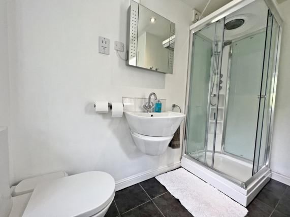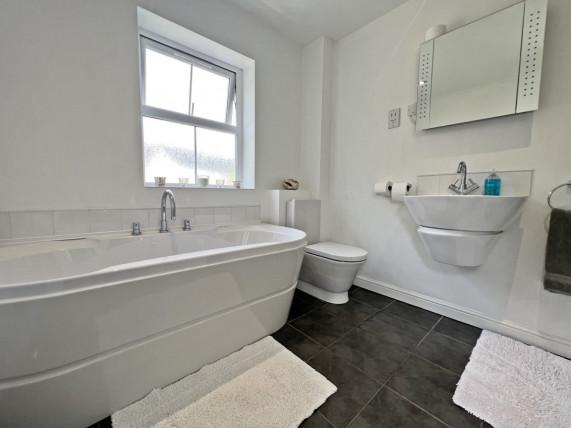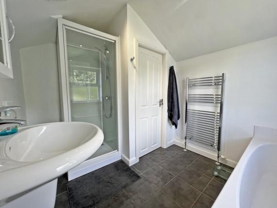 BATHROOM (98 x 710 approx.) Four piece white suite comprising double ended bath with centre taps, corner shower cubicle, wall mounted wash hand basin with illuminated mirror above and WC. Chrome towel radiator.
