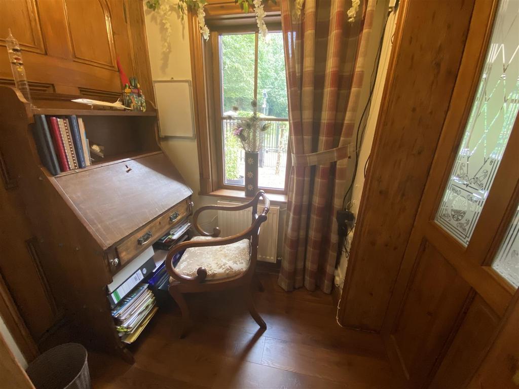Dining Room - The dining room features two arched windows to the front of the house and two smaller arched windows to the side. Chimney breast with inset fireplace with working chimney. Stripped wooden floor. Radiator.