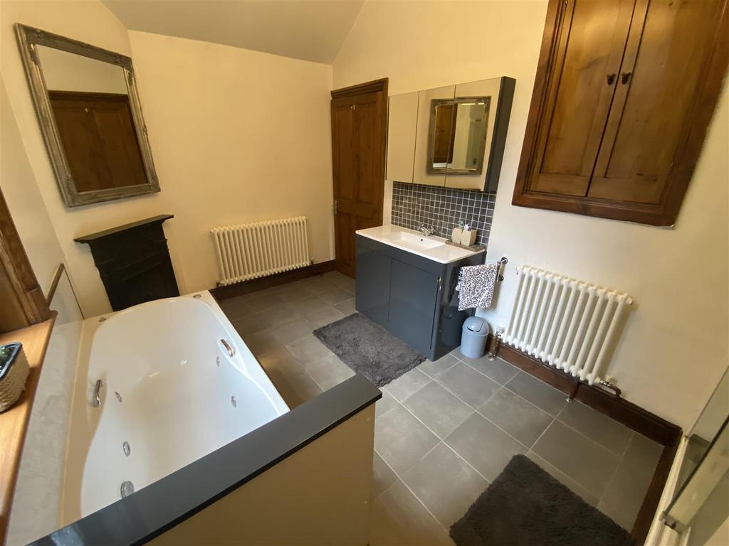 Bathroom - A super-stylish bathroom featuring a white contemporary style suite with: whirlpool bath, vanity basin, walk-in shower enclosure with glass screen and thermostatic shower, enclosed cistern WC. Chimney breast with period style feature fireplace. Ceramic tile floor, arched window to the side of the house. Radiator.