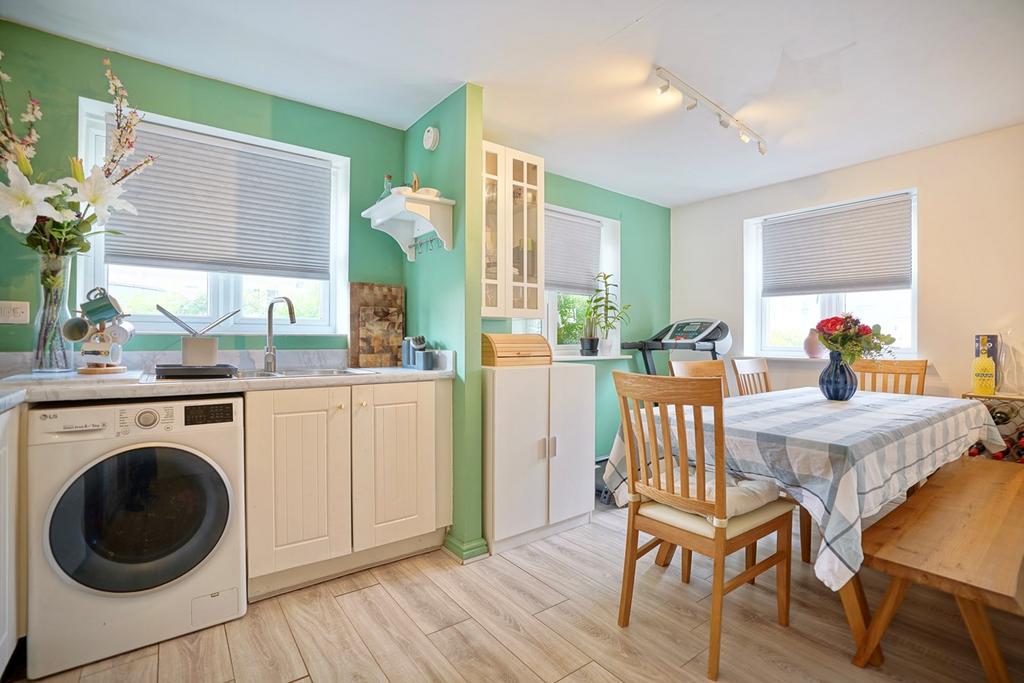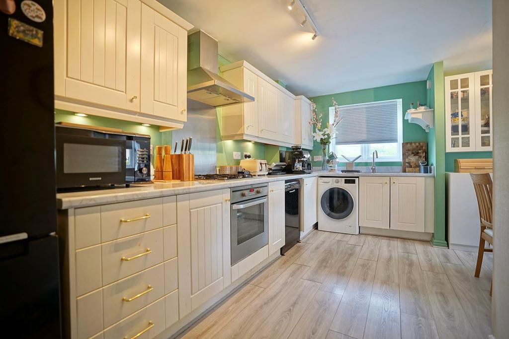 A double aspect room with windows to front and side elevations, fitted in a modern range of base, drawer and wall mounted units with complementing work surfaces and up-stands, one and a half bowl single drainer sink unit with mixer tap, integrated appliances incorporating gas hob with stainless steel back plate and cooker hood over, electric oven, spaces and plumbing for washing machine and dishwasher, under stairs storage cupboard, two radiators, laminate flooring.