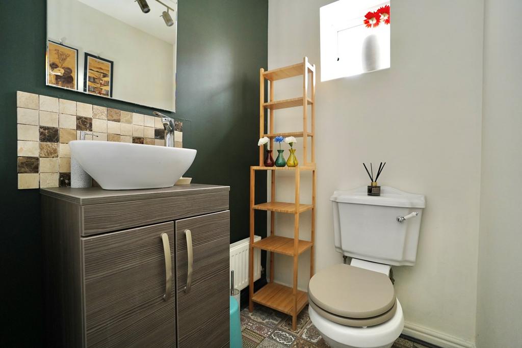 Double glazed window to front, re-fitted in a white two piece suite comprising low level WC, vanity wash hand basin with mixer tap, complementing tiling, porcelain tiled flooring, radiator.