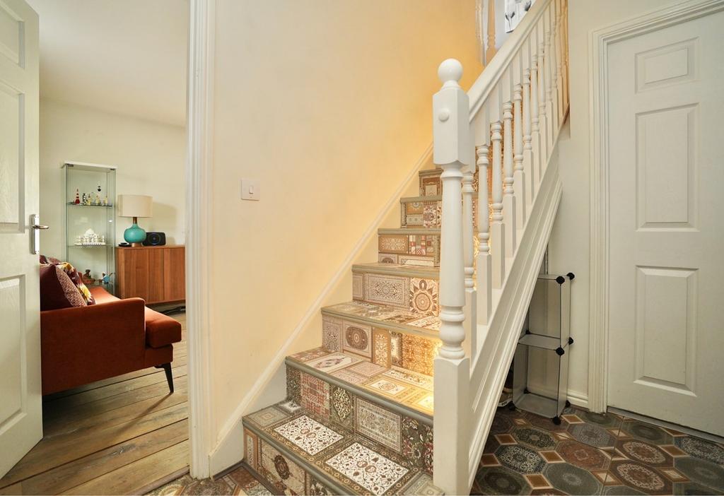 Central heating thermostat, stairs to first floor, under stairs storage recess, porcelain floor tiling.