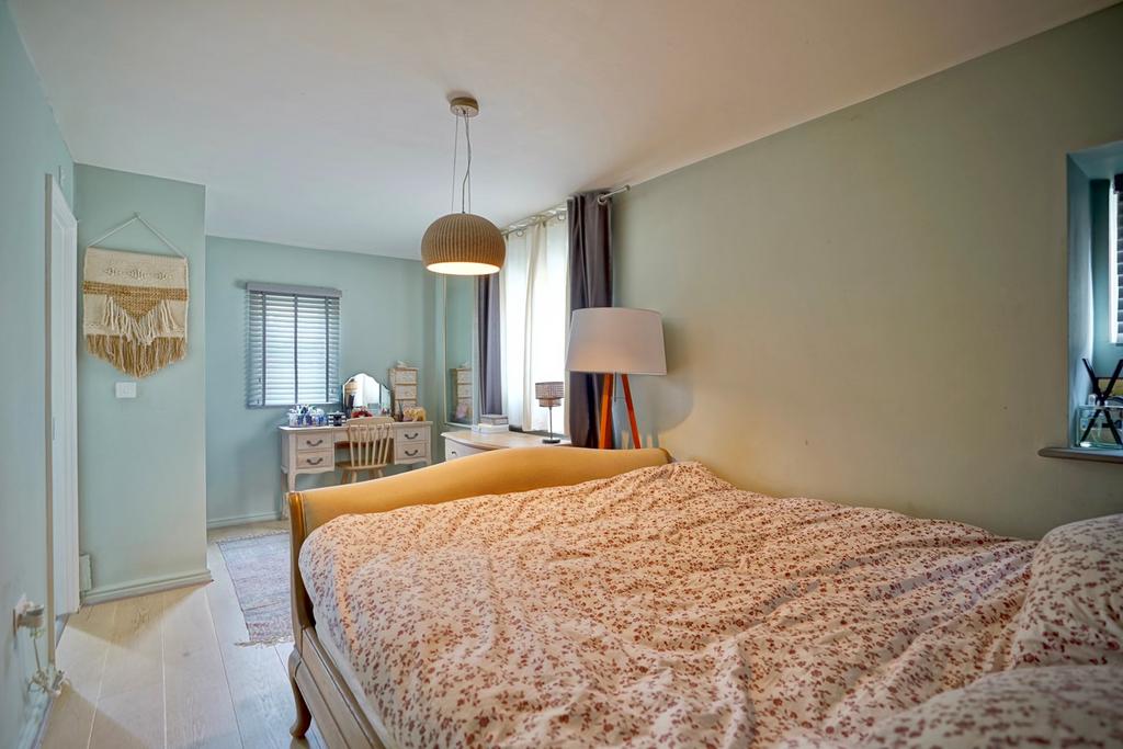 A double aspect room with two double glazed windows to front and double glazed window to side aspect, double built in wardrobe with hanging and shelving, radiator, engineered wood flooring.
