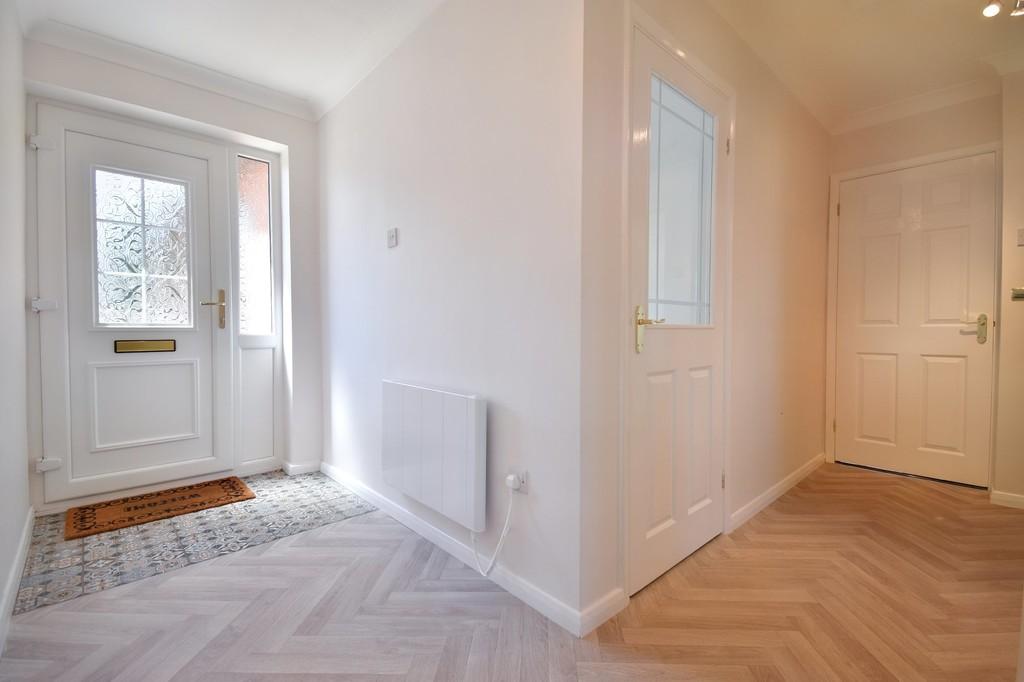 Entrance Hall Accessed via the front door, being part-glazed uPVC with frosted glass window, into the spacious L-shaped hall with initially decorative tiled floor leading into the herringbone-effect vinyl cushion flooring with six-panel doors into principal rooms. Loft hatch to roof space which is boarded for storage. Spotlights to ceiling and neutral decoration throughout. Door into the laundry cupboard, fitted with shelving and housing the Sunamp Thermino electric instant hot water heating system.