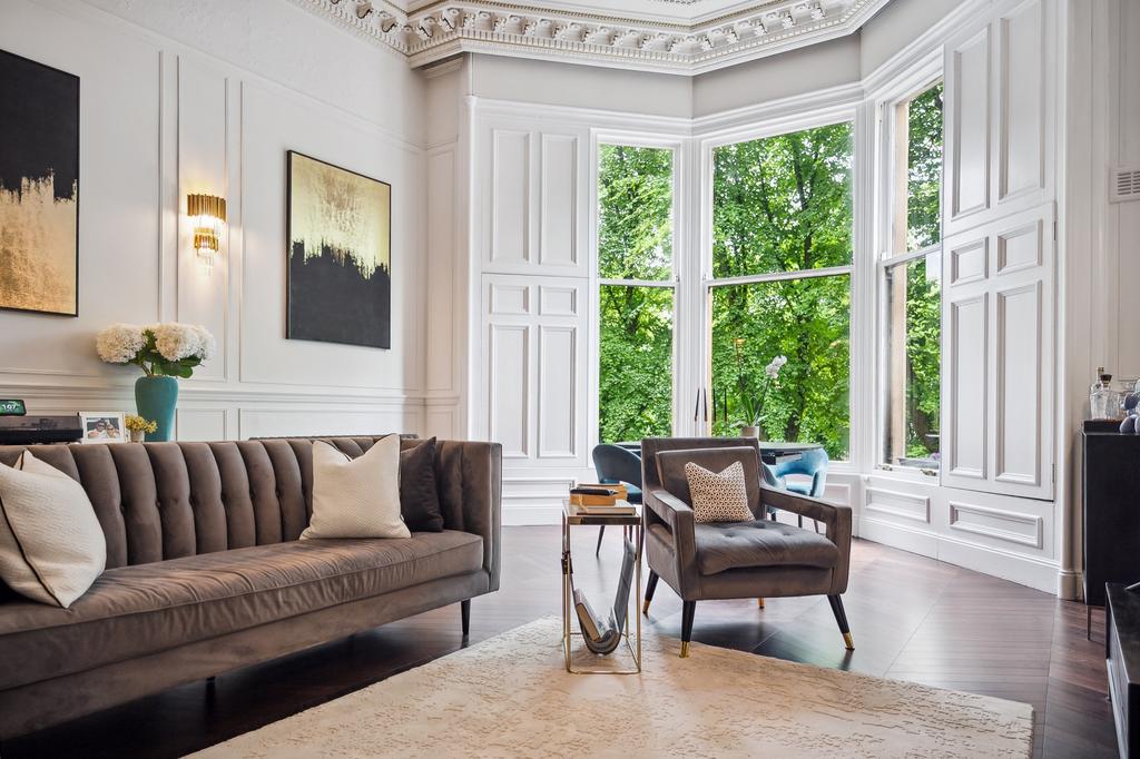 Held within a beautiful B listed terrace and tucked away in a peaceful, leafy residential location within 0.5 miles of Byres Road, this impeccable three bedroom elevated ground floor conversion has been professionally renovated to an exceptional specification and offers stylish, modernised living space which is filled with stunning traditional features.