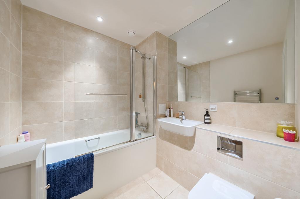A beautifully tiled bathroom with a shower over the bath. The clean design and modern fixtures create a serene space for relaxation.