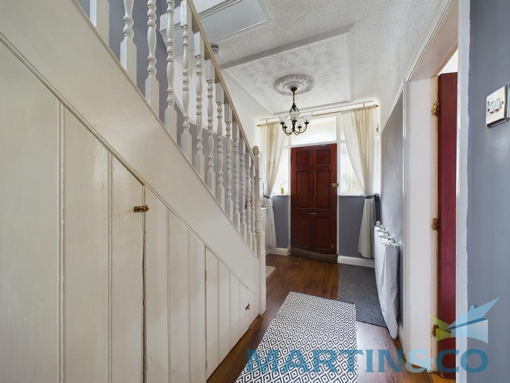 HALLWAY 12' 7" x 6' 6" (3.84m x 1.99m) An inviting Hallway setting the stylish tone throughout this property and having wood effect flooring, wooden entrance door, under stairs storage cupboard, radiator, and stairs to first floor