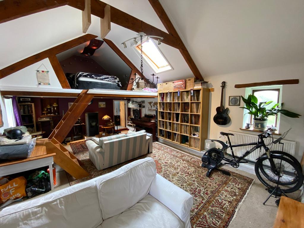30' 0" x 16' 0" (9.14m x 4.88m). With double aspect windows to the front and rear, Velux roof window, staircase leading to the mezzanine floor, two radiators, wood pellet stove.