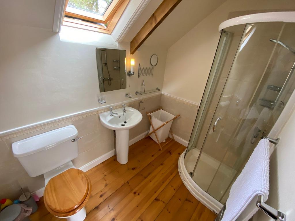 With corner shower cubicle, low level flush w.c., pedestal wash hand basin, chrome heated towel rail, Velux roof window, radiator.