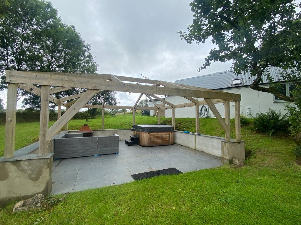 Recently completed with a large stone patio and wooden pergola surround, providing a delightful outdoor entertaining area.