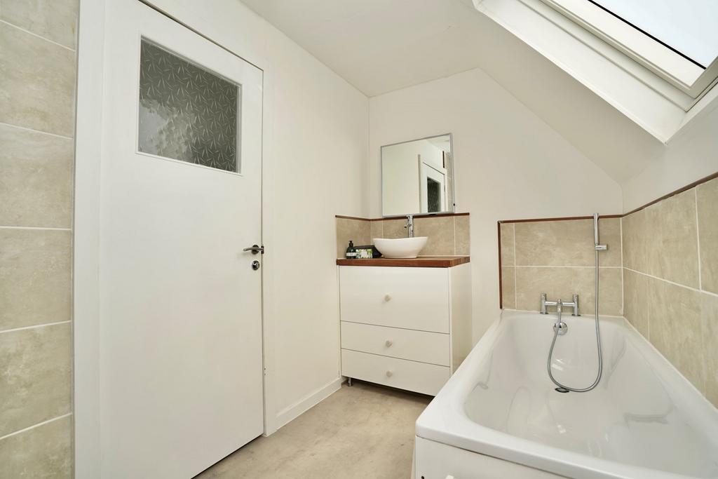 Velux window to side aspect, fitted in a four piece suite comprising surface mounted oval sink unit with mono bloc mixer tap, drawer units, storage, panel bath with hand mixer shower, double panel radiator, low level WC, screened shower enclosure with independent shower unit fitted over, eaves storge cupboard, vinyl floor covering, extensive ceramic tiling.