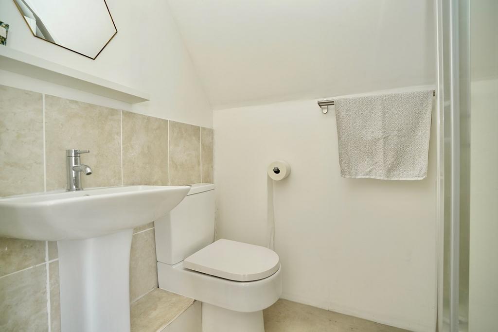 Fitted in a range of white sanitaryware comprising low level WC, pedestal wash hand basin with mixer tap and tiling, screened shower enclosure with independent shower unit fitted over, shaver point, composite flooring.