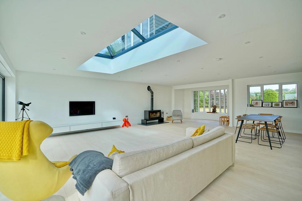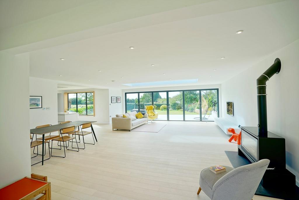 A stunning open plan contemporary space incorporating living areas, dining area and bespoke kitchen. A light double aspect space with UPVC bow window to front and additional window to front and bi-fold doors accessing garden terrace to the rear, architectural lantern, recessed lighting, TV point, telephone point, under floor heating, a central Stovax wood burner with slate hearth, dimer switch, central heating thermostat, Boen engineered wood flooring.